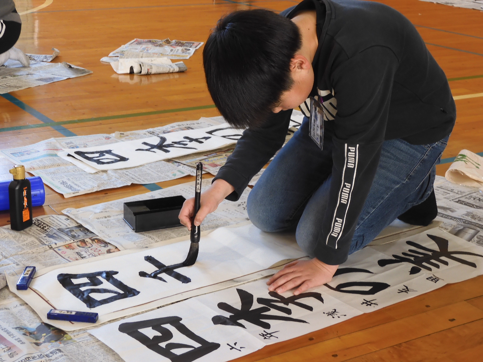 1月7日と8日の2日間にわたり、体育館にて「校内書き初め会」を行いました。 例年通り、体育館は底冷えする寒さとなりましたが、一歩足を踏み入れると、そこには寒さを忘れさせるほどの心地よい緊張感と、シーンと静まり返った静寂が広がっていました。