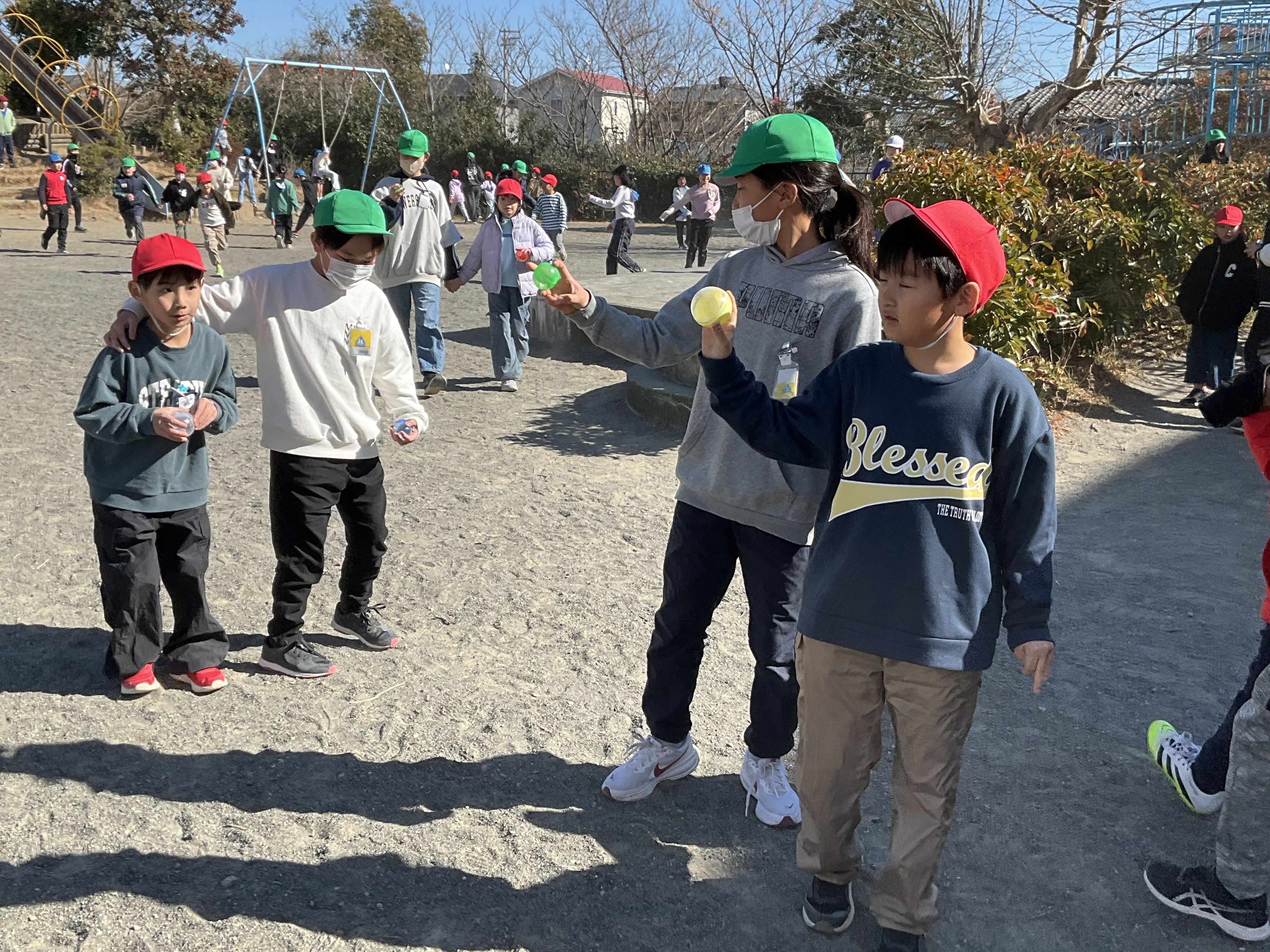 今回は異学年交流を深めるため、1・6年、2・5年、3・4年のペアで挑戦です。小グラウンドやなかよし山、芝生の広場に中庭と、校内のあちこちに隠された「お宝カプセル」をペアで協力して探しました。