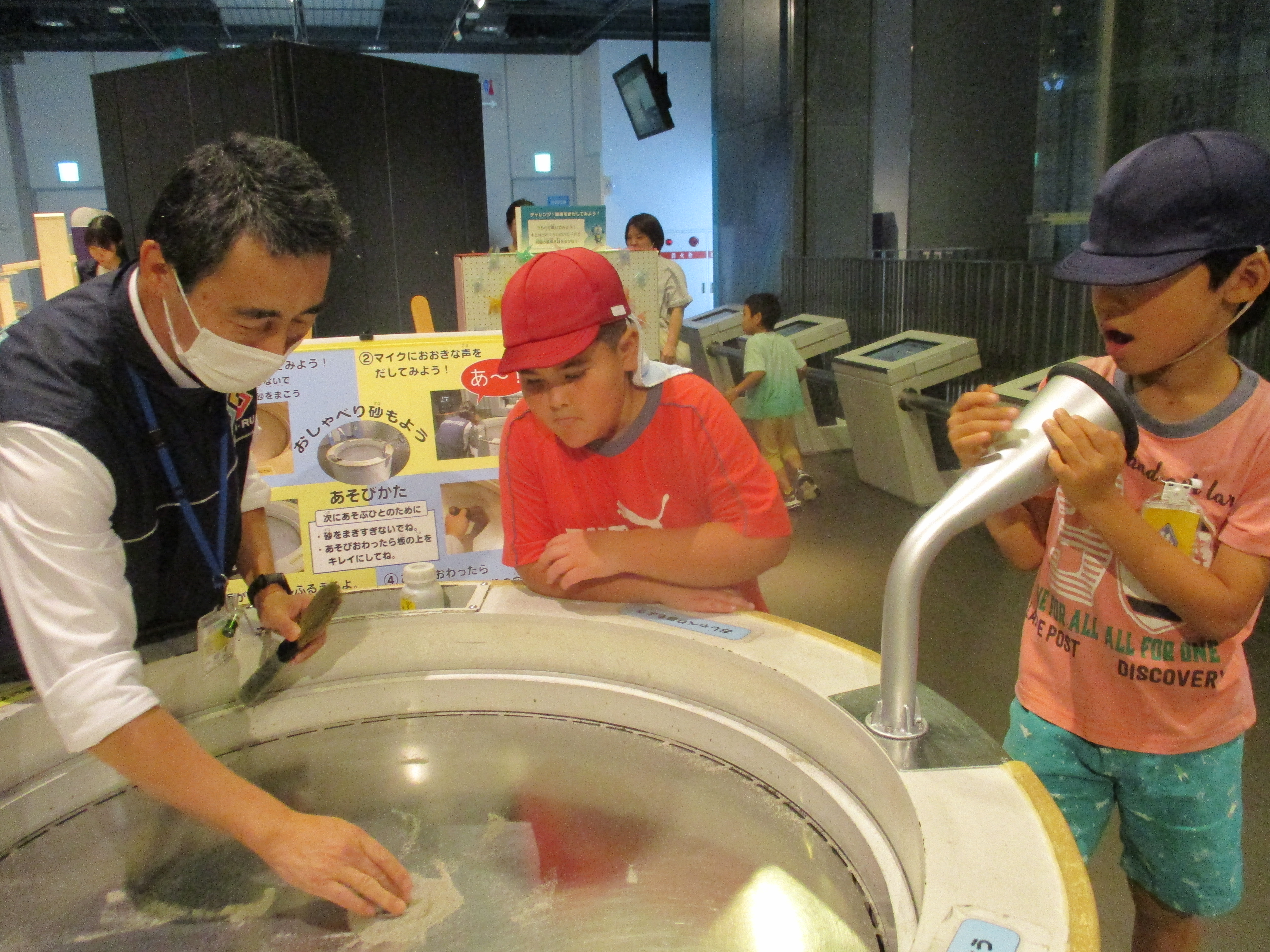 「る・く・る」に到着すると、子どもたちは目を輝かせながら様々な展示に見入っていました。自分で電気を起こす「グルグル発電マシン」や、暗闇の中を手探りで進む「まっくら迷路」、レーザー光線をよけて進むアトラクションなど、五感を使いながら科学の不思議を体いっぱいに体験しました。