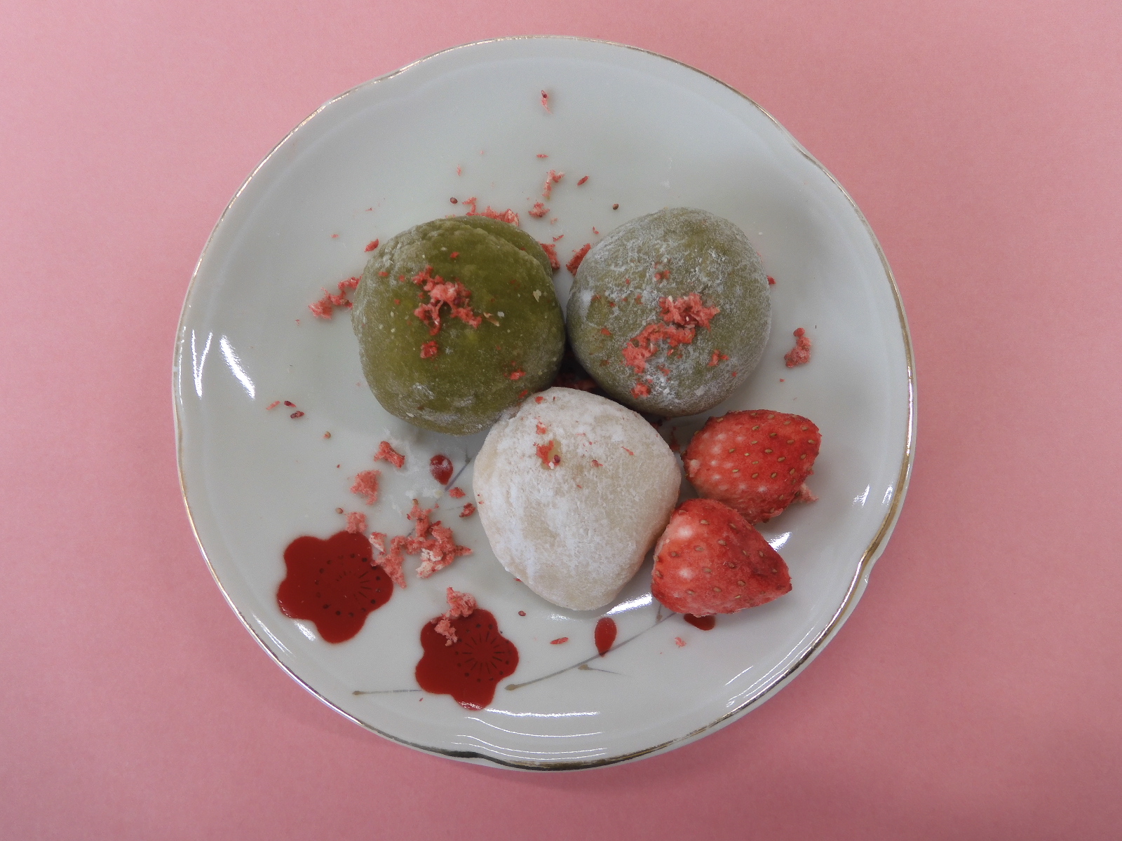 第一回目の試作では、子供たちがアイデアを出し合い、工夫を凝らしました。大福の命ともいえるあんこは、さつまいもを丁寧につぶし、キビ砂糖と牛乳で優しい甘さに味付け。皮には、白玉粉をベースに、抹茶の粉(ミクロンティー)を混ぜ込み、鮮やかな緑色を目指しました。さらに、彩りと食感のアクセントとして、フリーズドライのイチゴを細かく砕いてトッピングしました。
