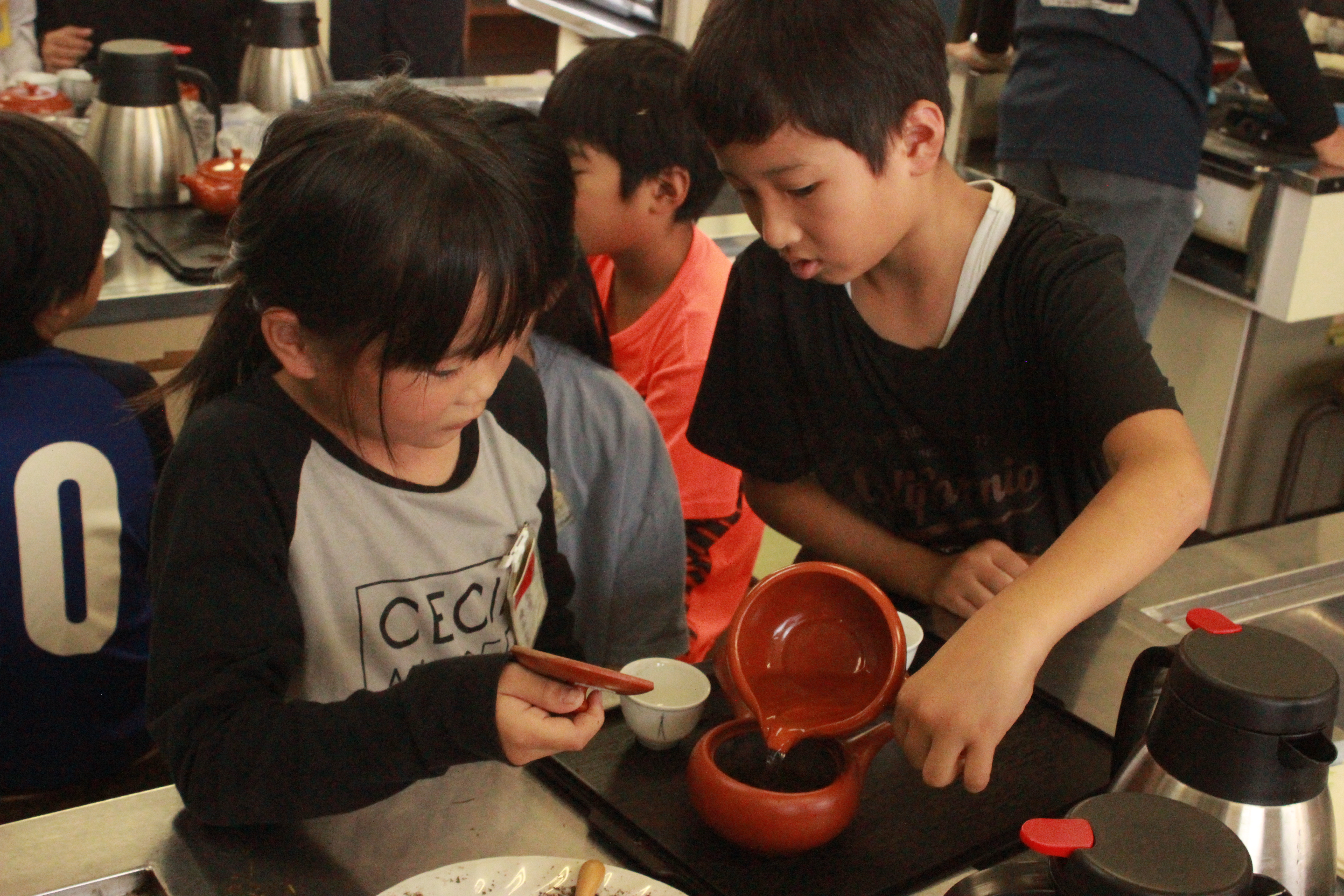 淹れたてのお茶を試飲すると、1杯目は「にがい!」と驚きの声が上がりましたが、2杯目は香ばしい香りを楽しみながら、「おいしい」と笑顔で味わっていました。